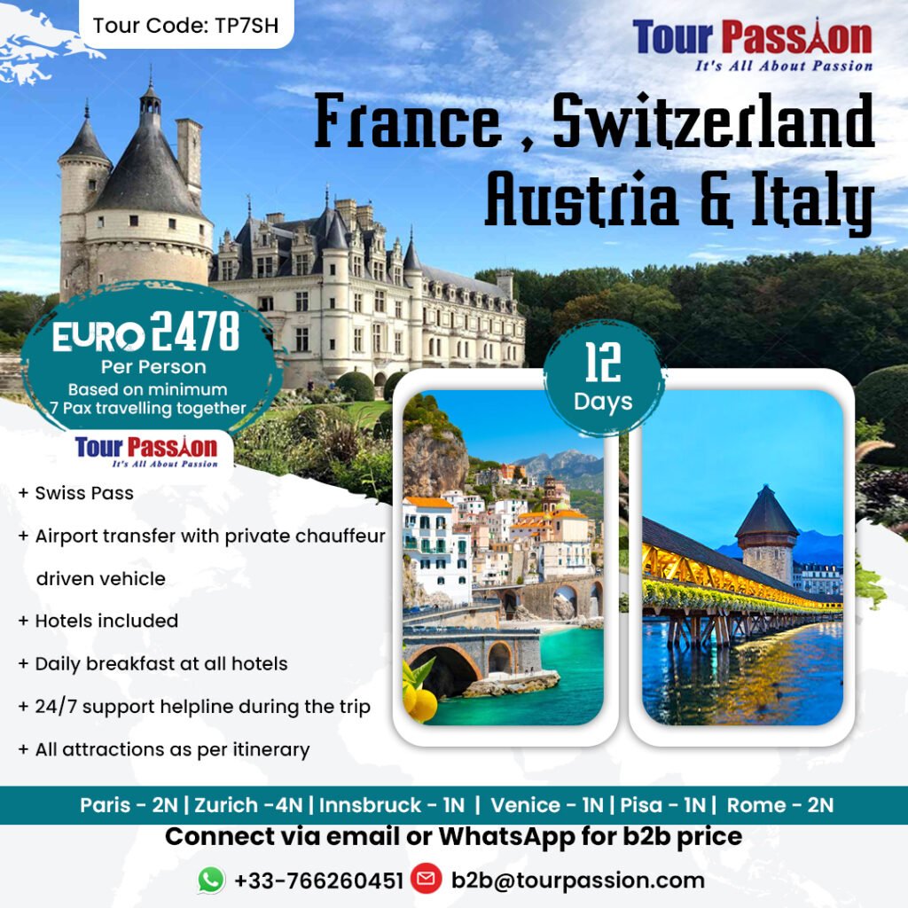 通过Tour Passion精心打造的12天法国、瑞士、奥地利、意大利旅游套餐,探索欧洲精华。这是一款完美设计的欧洲多国半私人定制游,包含酒店、火车票、瑞士通票及私人接送服务。此高人气巴黎–苏黎世–因斯布鲁克–威尼斯–比萨–罗马行程,将浪漫情怀、阿尔卑斯探险、风景铁路之旅与标志性地标无缝融合于一次精彩体验之中。包含埃菲尔铁塔三层门票、塞纳河游船、瑞士通票出行、皮拉图斯山之旅、施华洛世奇水晶世界、威尼斯贡多拉体验以及罗马随上随下观光巴士——尽在这一高性价比欧洲四国假期套餐之中。